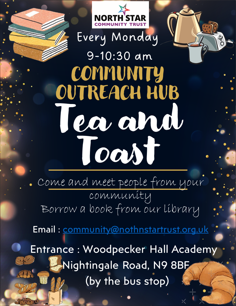 Join the Outreach team for FREE Tea & Toast every Monday 9-10.30am in the Community Outreach Hub. It’s a great chance to meet people from your community, or just relax with a book from our library. Entrance: Woodpecker Hall Academy, Nightingale Road, N9 8BF (by the bus stop). Contact the Outreach team at [email protected]