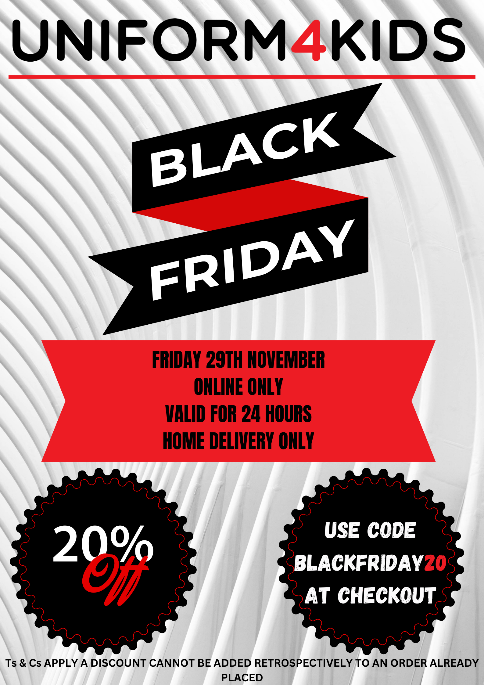 Get 20% off all products—schoolwear, sportswear, footwear, and accessories—Friday, 29 November. Online only at www.uniform4kids.com. Use code BLACKFRIDAY20 at checkout.