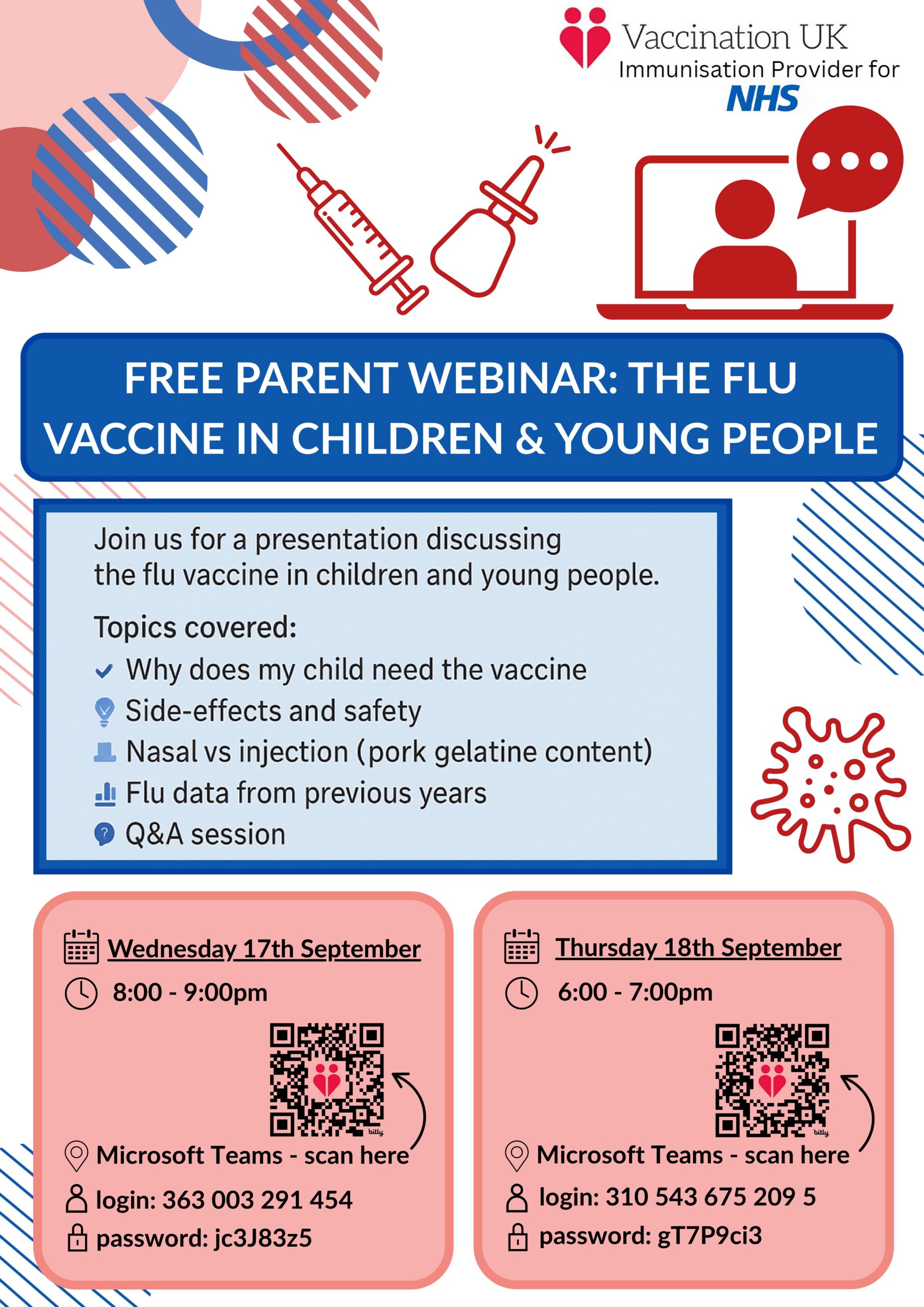 The NHS are offering free online Flu seminars on 17th and 18th September for any parent who may have questions about the vaccinations.